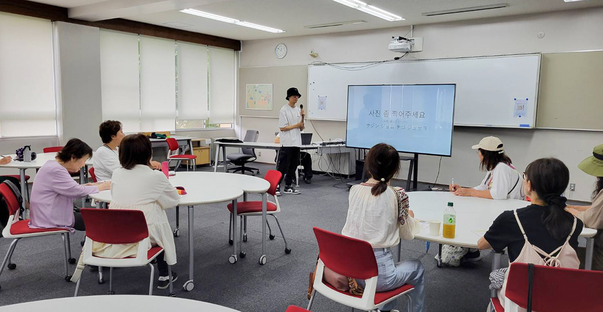 語学体験として実施された韓国語講座では、本学の協定校・韓国の聖潔大学からの交換留学生、ヤン・ソンビンさんが講師を務めました。講座では「超簡単実戦韓国語」をテーマに、旅行や日常会話で使える表現を紹介。参加者は会話練習を交えながら、楽しみつつ学ぶひとときとなりました。学内外からの参加もあり、国際交流の幅広さを感じる時間となりました。