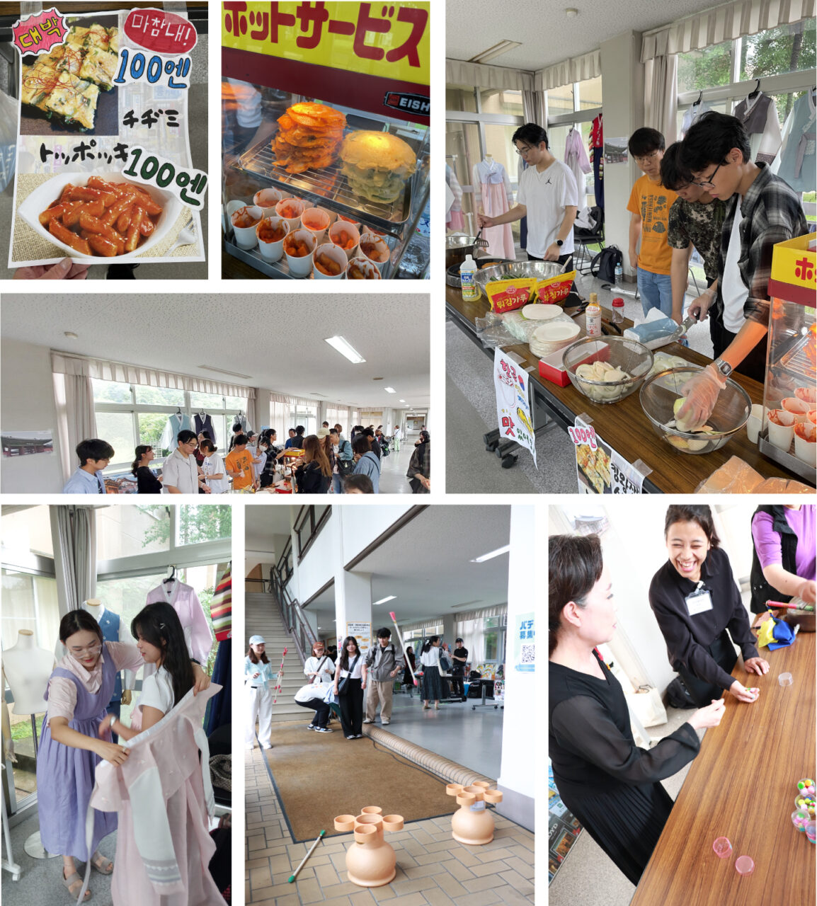 本学の韓国人留学生が中心となって企画・運営を担当。韓国文化を多角的に紹介するブースや体験企画を用意しました。 当日は、手作りの看板を作成し、韓国の定番屋台グルメ「チヂミ」や「トッポッキ」の調理・販売を行いました。特にトッポッキは販売開始から間もなく完売するほどの人気ぶりでした。来場者からは「本場の味が楽しめた」と好評の声が寄せられました。
