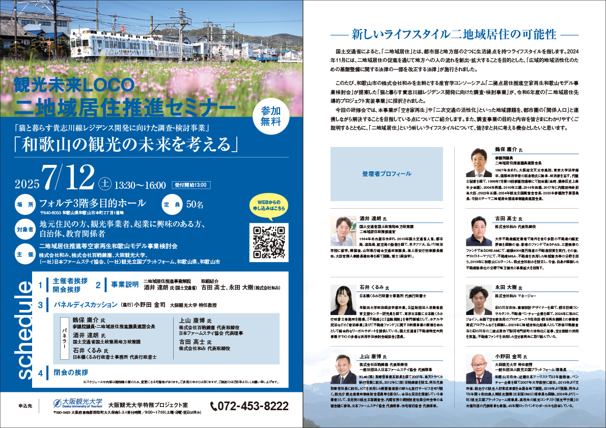セミナーでは、「空き家再生」や「二次交通の活性化」といった地域課題に対し、「二地域居住」というライフスタイルを通じて取り組む本事業の全体像を、多様な専門家と共に考える機会といたします。