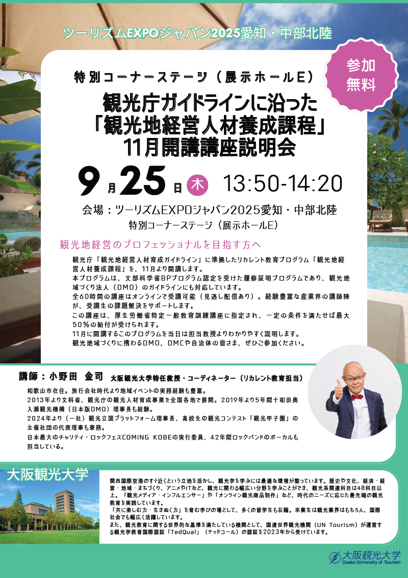 また、25日(木)13:50~14:20、特別コーナーステージにて 本学の小野田金司特任教授による「観光庁ガイドラインに沿った観光地経営人材養成課程カリキュラム説明会」を開催します。