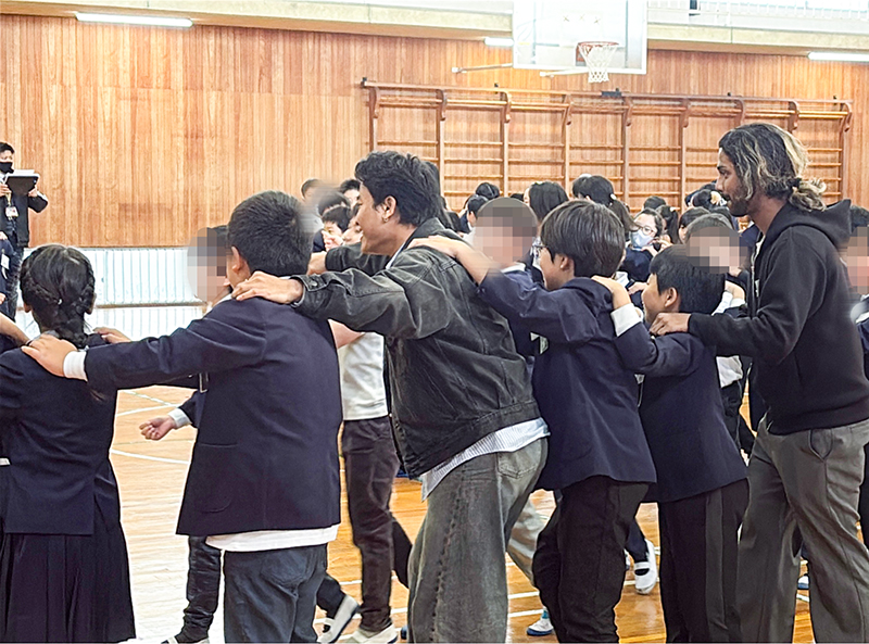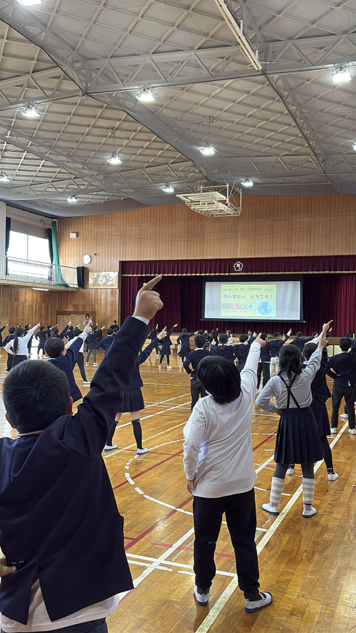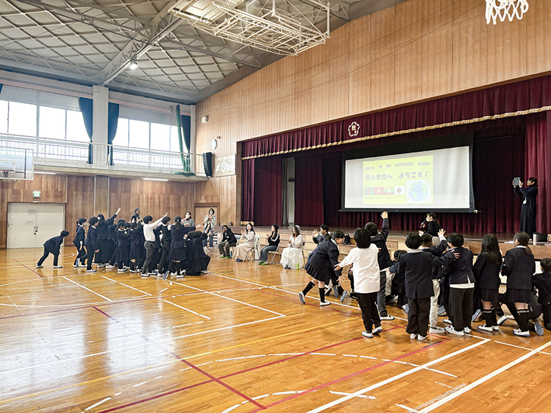 本学学生にとって小学校での交流は初めての経験でしたが、体育館で行われた歓迎セレモニーでは、児童の皆さんによる元気いっぱいのダンスが披露され、和やかな雰囲気の中で交流がスタートしました。