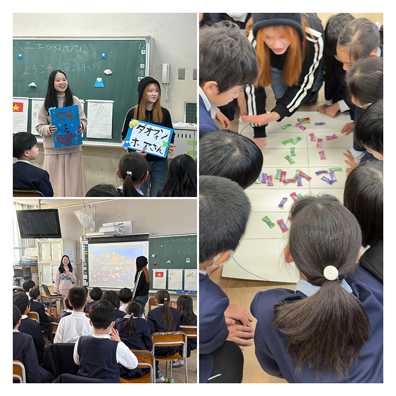 また、ベトナム出身の学生が母国の遊びを準備し、クラス全員で体験する時間も設けられました。 交流のはじめは緊張した様子も見られた本学学生でしたが、人懐っこく積極的に話しかけてくれる児童の皆さんとの触れ合いを通して次第に打ち解け、終始笑顔あふれる温かな交流の時間となりました。