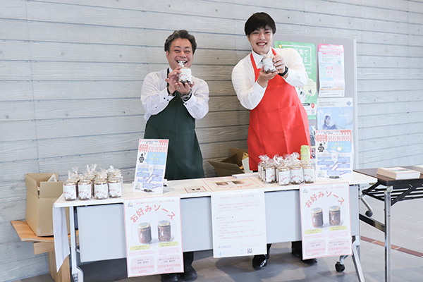 会場の受付ロビーでは、 山本ゼミと泉佐野市の「いずみピクルス(NSW株式会社)」が共同開発した特製お好みソースが販売され、地元の泉州玉ねぎの旨みを活かした自信作を手に取る多くの来場者で賑わいました。