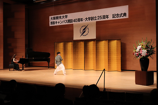 午後1時より執り行われた記念式典では、司会の冨手貴子講師(観光学部)による進行のもと、速水聡子講師によるピアノ演奏「喜びの島」で華やかに幕を開けました。 また、伊原木幸馬客員准教授による学歌独唱がが行われ、会場は厳かな空気に包まれました 。